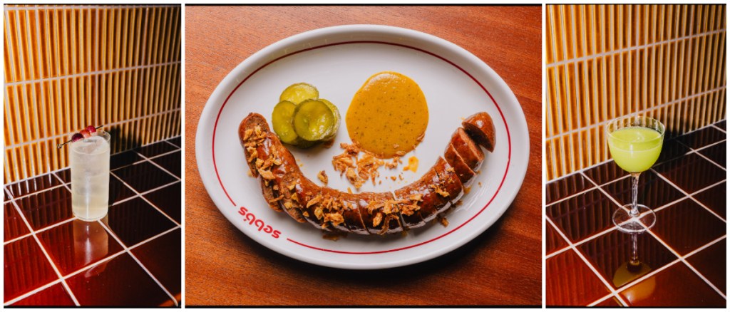 Located underneath Margo, the recently-announced restaurant also by Scoop on Miller Street, Sebb’s will seat 68, with a further 12 covers in the private dining room, ‘The Record Room’. The vaulted brick ceiling brings an industrial feel to the space, softened by comfortable booth seating and accents of coloured tiles. A dedicated viewing window looks onto the mixology room, while the open kitchen is centred around an expansive charcoal grill to give guests a glimpse of the live fire cooking. Tables will be available to book, with space also left for walk-ins.