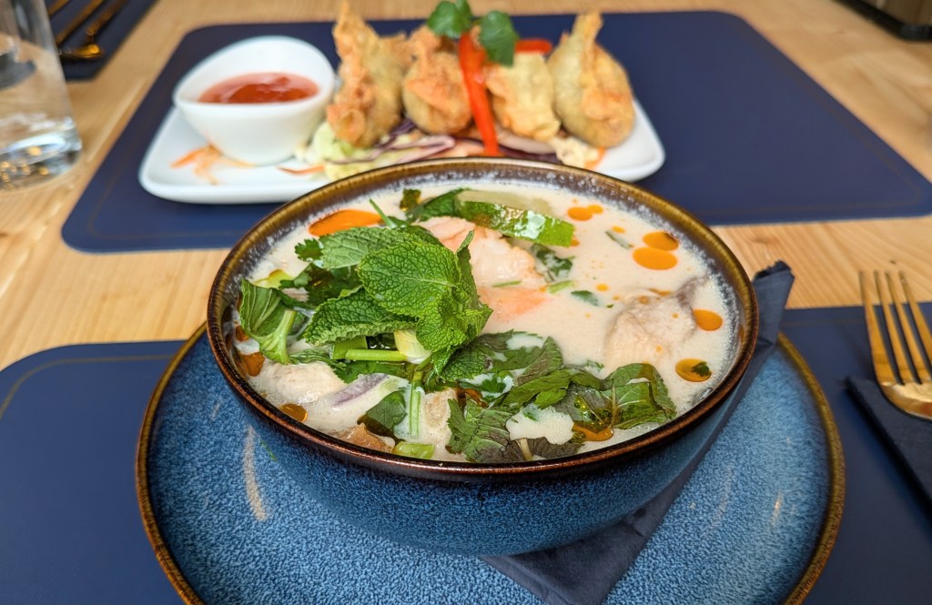 But then came the Tom Kha Soup, and honestly, this was a showstopper. A rich yet fresh coconut milk broth with galangal, kaffir lime leaves, lemongrass, chilli, coriander, mushrooms, tomatoes, onions, and a tangy hint of lime juice. This is one of Thailand’s greatest hits, and The Thai’s version hits every note. Creamy but not heavy, packed with vibrant herbs and spices. It’s the kind of soup that makes you momentarily forget where you are. (Shawlands? Bangkok? Who can say.)