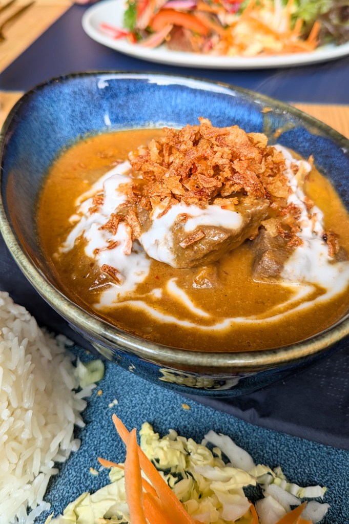 Felix had the Massaman Curry with Lamb, and it was the kind of dish you don’t want to end. Slow-cooked chunks of tender lamb mingling with aromatic spices, creamy coconut milk, and just the right touch of sweetness. The jasmine rice on the side played its role beautifully, soaking up every last bit of that gorgeous sauce.